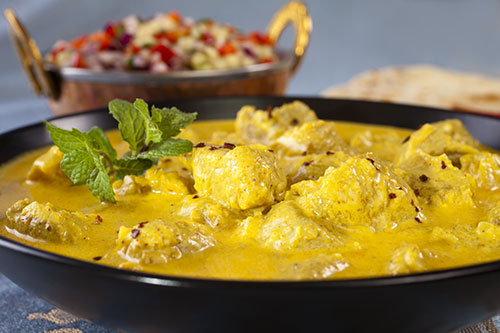 Cooked with 100% boneless breast meat flavoured with Indian spices & herbs, slow cooked in a rich cream sauceand garnished with a dash of coriander £8.95 -